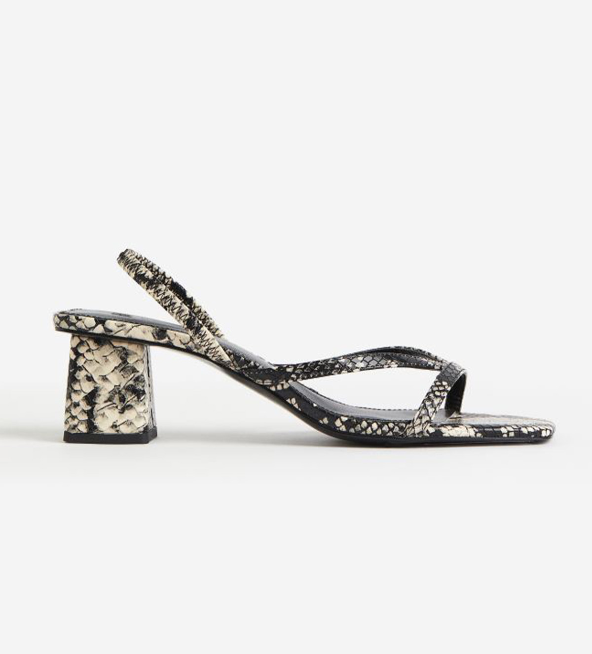صندل هایی با پنجه های مربعی، پاشنه های بلوک پوشیده، بند های باریک پا و بند پاشنه باریک و کشسان. پاشنه 5 سانتی متر.